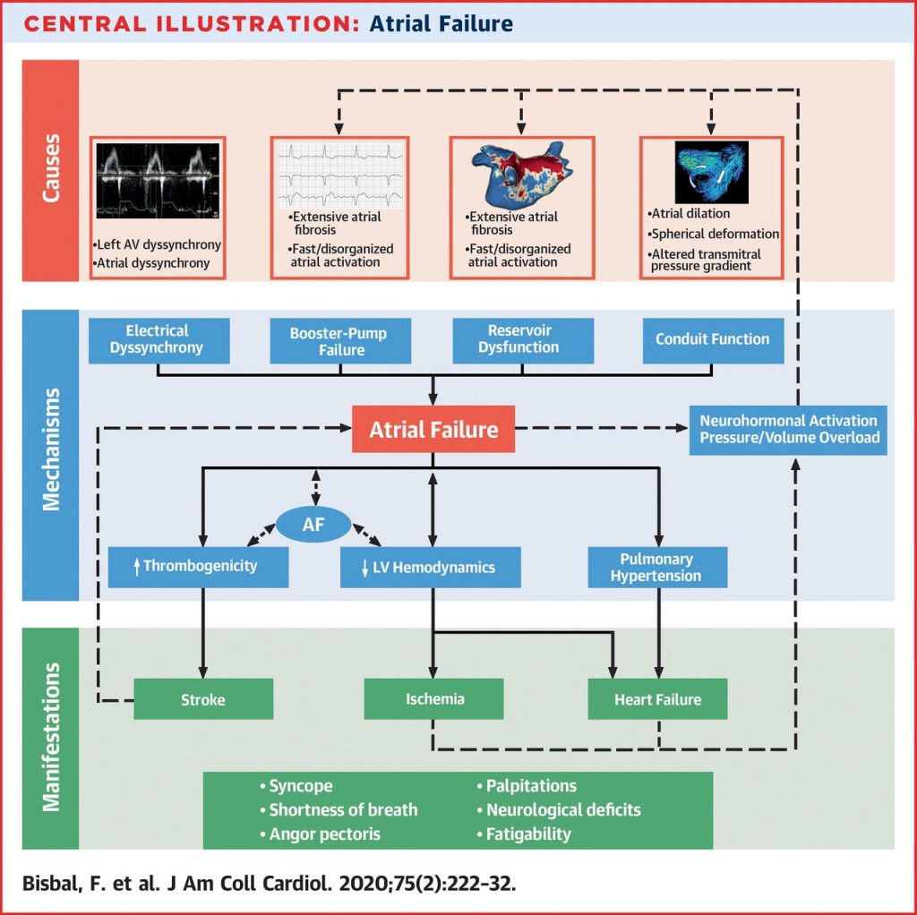 The authors state: “Atrial dysfunction has been widely considered a marker or consequence of other cardiac conditions rather than the cause itself. Here, we propose the term atrial failure as a clinically relevant entity, defined as any atrial dysfunction causing impaired heart performance, symptoms, and worsening quality of life or life expectancy. Aspects of the etiology, mechanisms, and consequences of atrial failure are discussed. Recent advances in cardiac electrophysiology and imaging have improved our understanding of the highly complex atrial anatomy and function, underlying the paramount importance of the atria in optimal heart performance. It is time to reappraise the concept of the failing atrium as a primary cause or aggravating factor of the symptoms in many of our patients. The concept of atrial failure may foster basic and translational research to gain a better understanding of how to identify and manage atrial dysfunction.”