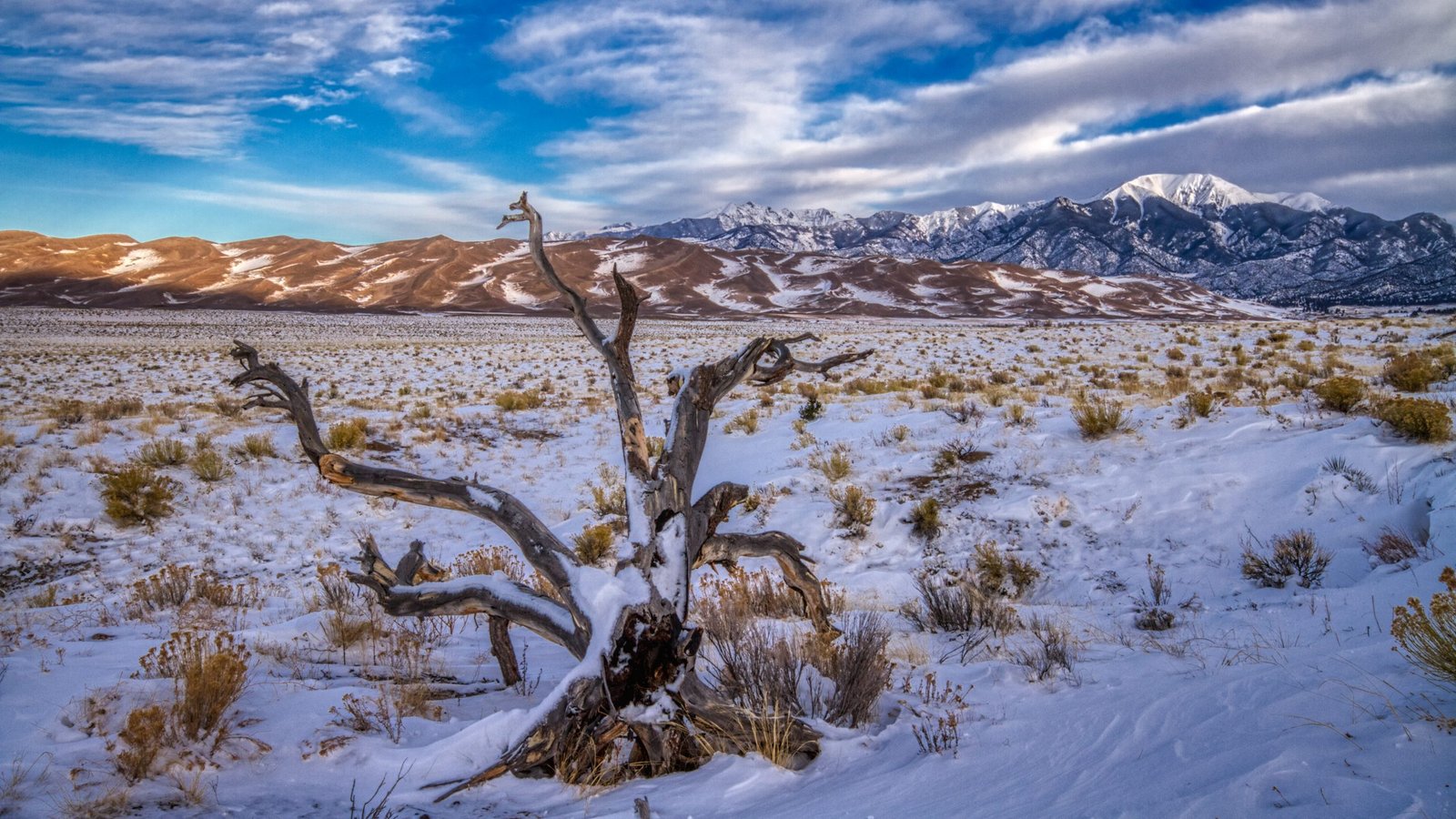 I heard there was a big storm coming and drove my Jeep 250 miles to the Great Sand Dunes National Park in December 2015. The drive was a bear, US285 was mostly unploughed. When I reached the park early in the morning, I had the Sand Dunes to myself for almost 2 hours. Windchill was bad enough that I could get my hands out of the mittens for only long enough to press the shutter and they would freeze. But it was worth it!