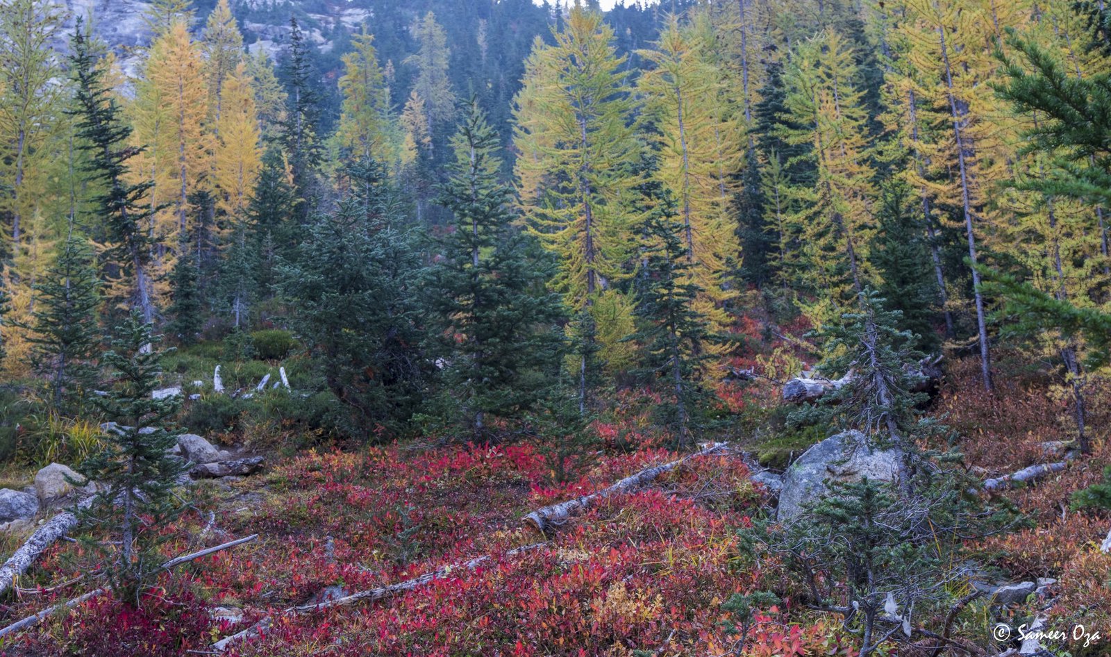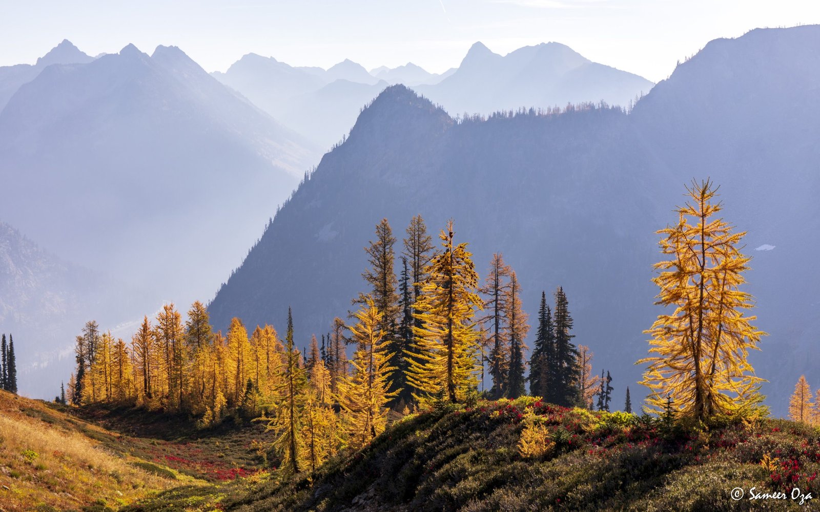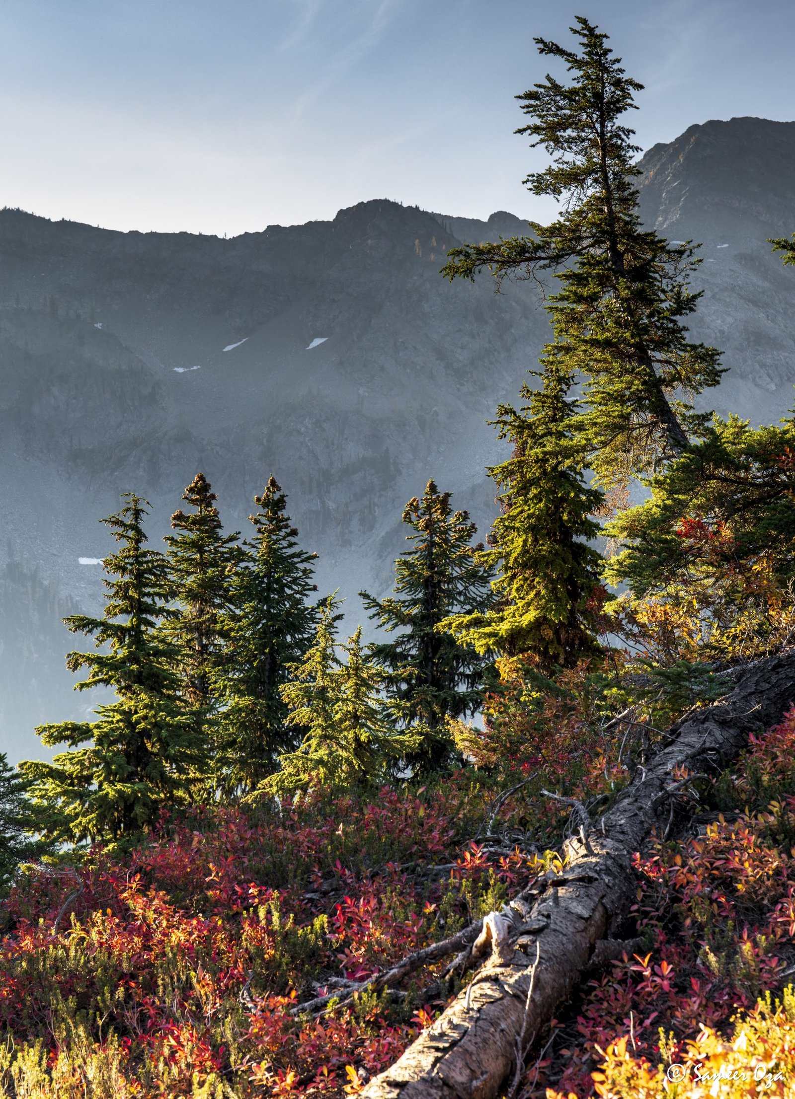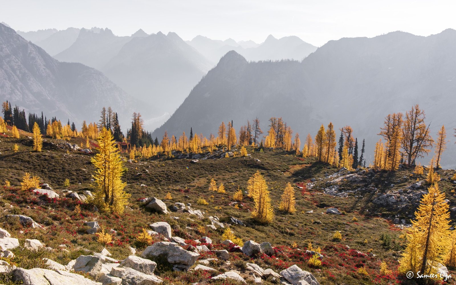 The north Cascades fall colors rival the Colorado Southwest. The yellow and red contrast is what stands out the best in my opinion. In Colorado it is the quaking aspens & cottonwoods contrasting with the Gambel oaks. In the north Cascades it is the larch (tamarack) contrasting against the red ground cover of the blueberry bushes. There is one major difference though. The Colorado fall colors are matte. The Cascade fall colors, especially the larch are glossy. The larch positively glows especially with back light from the sun! These are photographs I made from the Blue Lake and Heather-Maple Pass hikes. Further west there was a fire, so the smoke in the air made for some ethereal pictures and also made the morning alpenglow last a lot longer than we are used to.