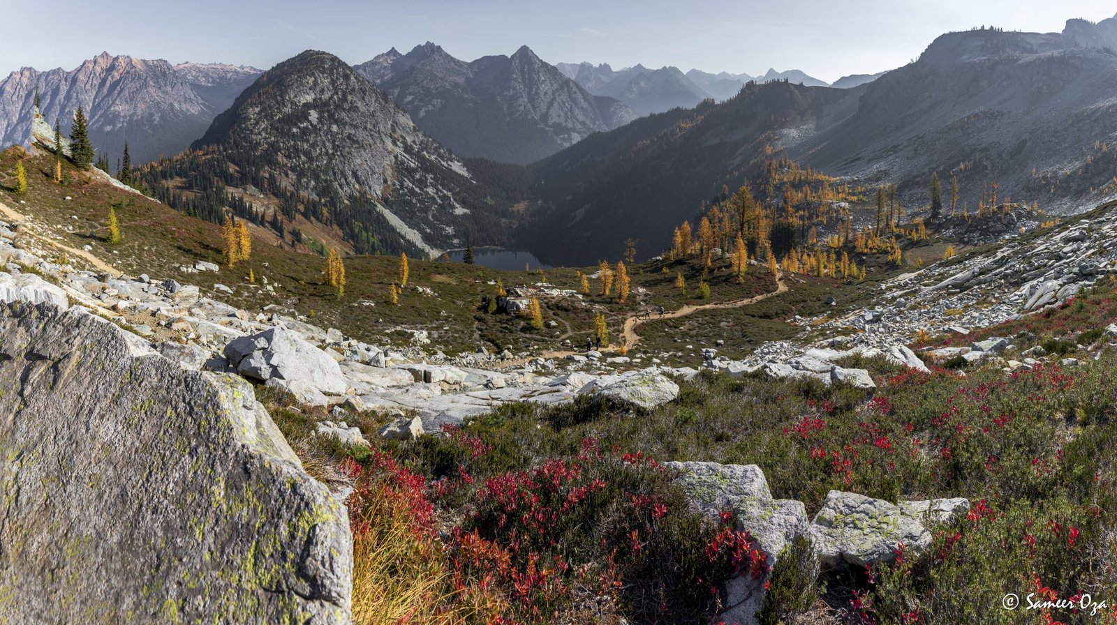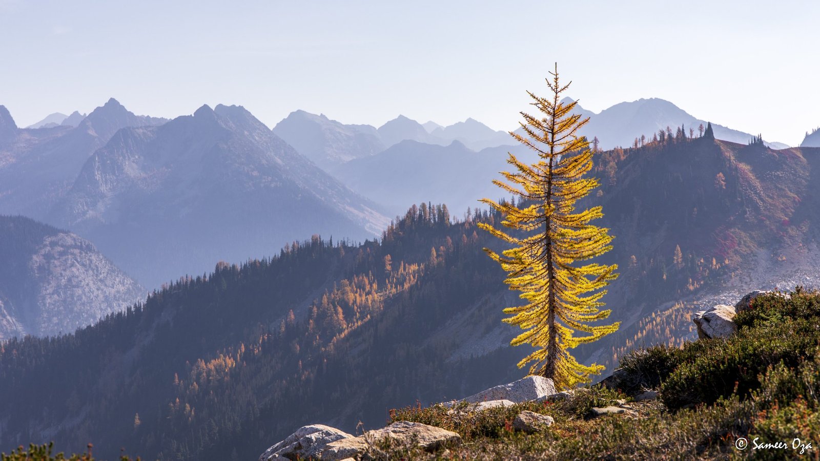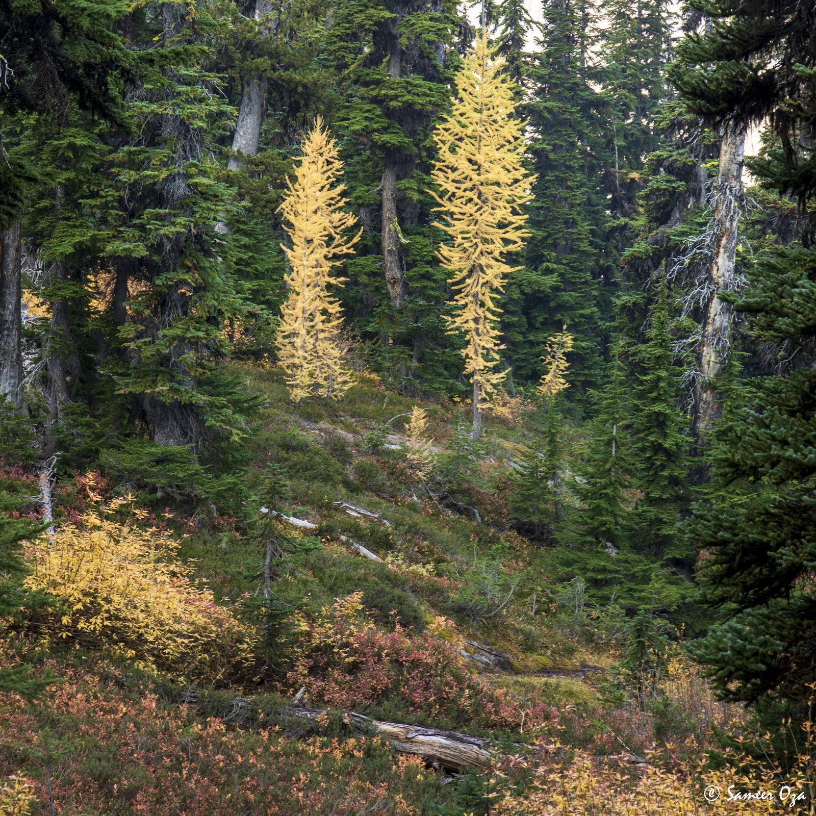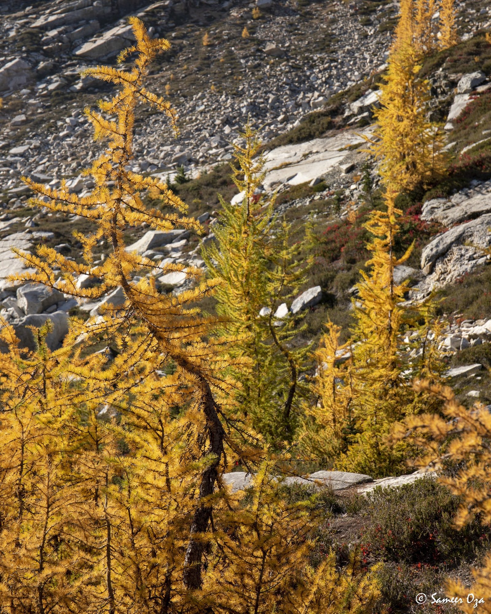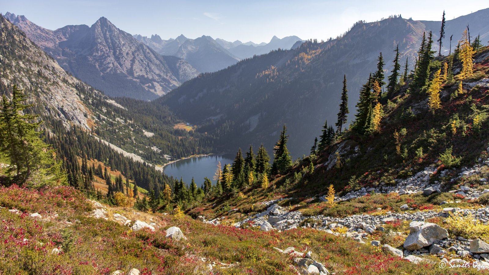 The north Cascades fall colors rival the Colorado Southwest. The yellow and red contrast is what stands out the best in my opinion. In Colorado it is the quaking aspens & cottonwoods contrasting with the Gambel oaks. In the north Cascades it is the larch (tamarack) contrasting against the red ground cover of the blueberry bushes. There is one major difference though. The Colorado fall colors are matte. The Cascade fall colors, especially the larch are glossy. The larch positively glows especially with back light from the sun! These are photographs I made from the Blue Lake and Heather-Maple Pass hikes. Further west there was a fire, so the smoke in the air made for some ethereal pictures and also made the morning alpenglow last a lot longer than we are used to.