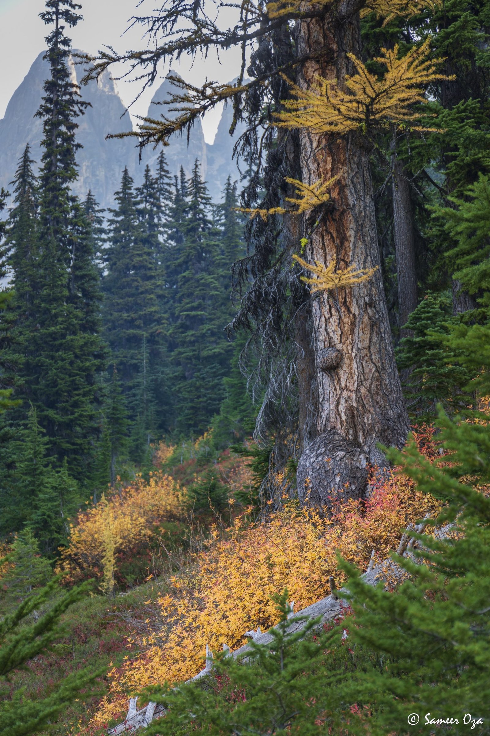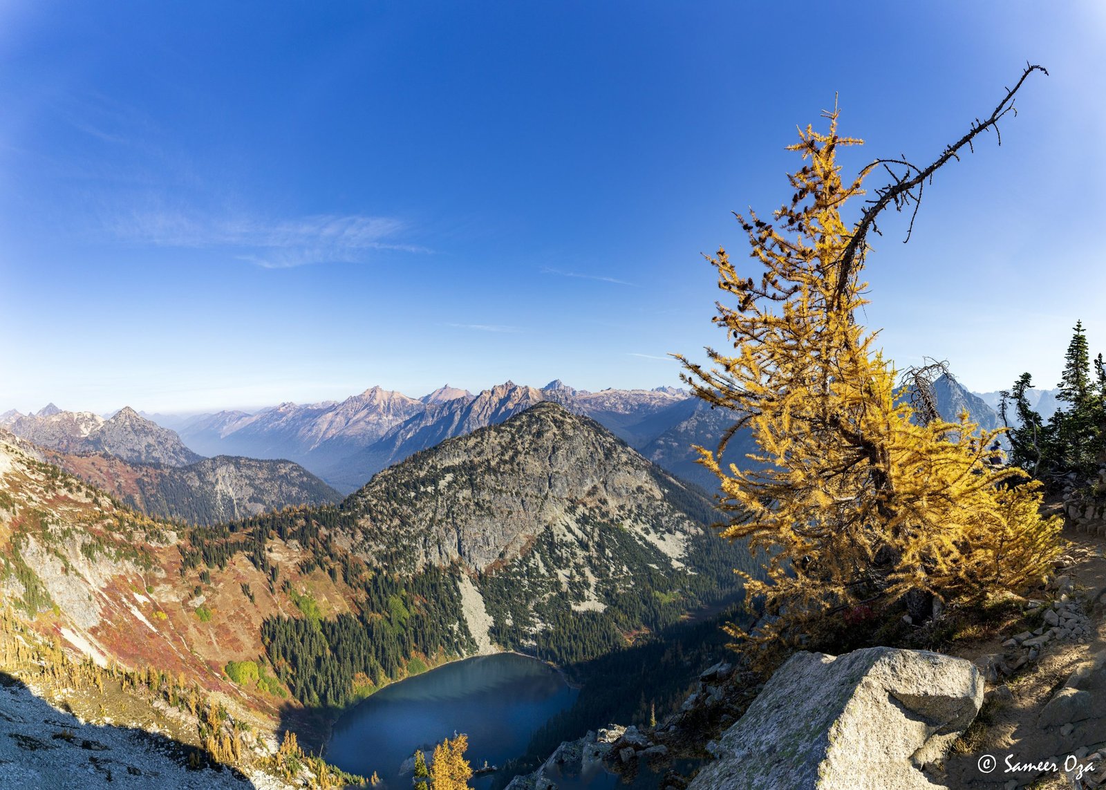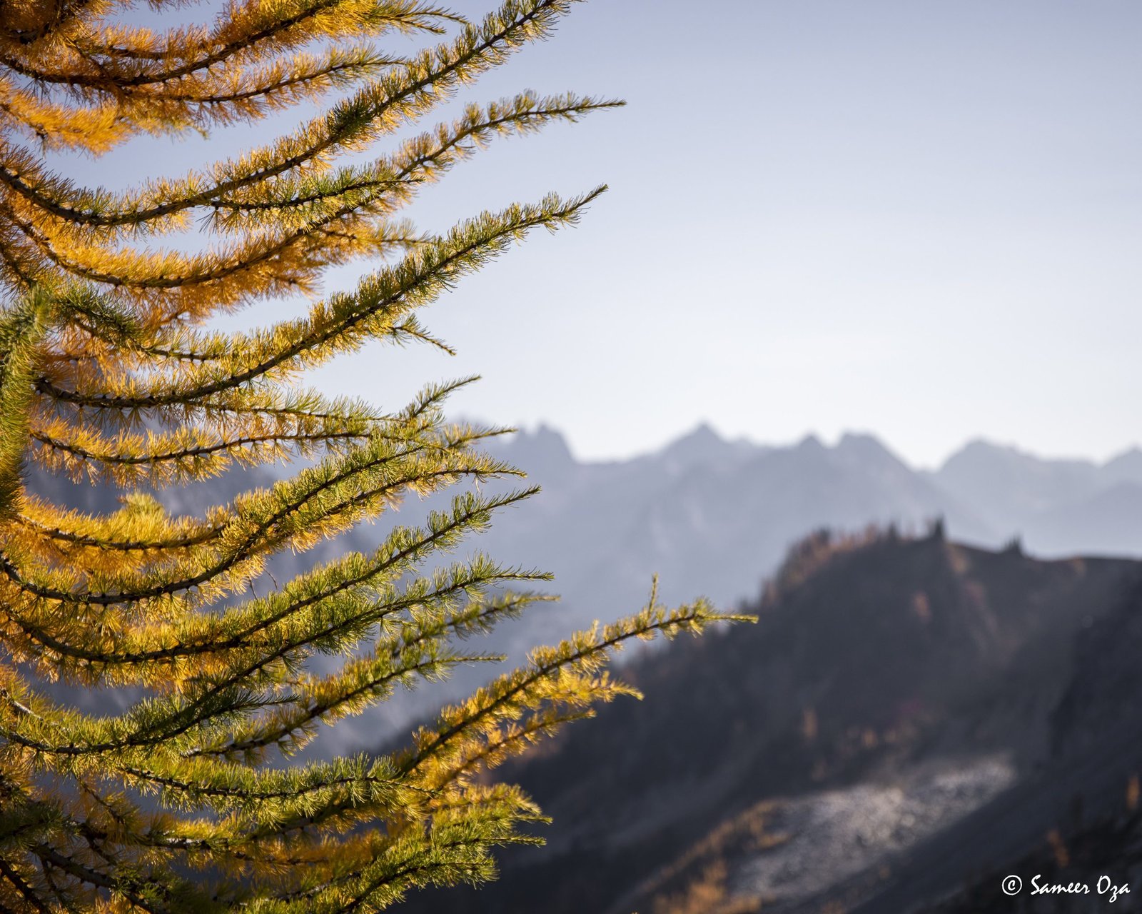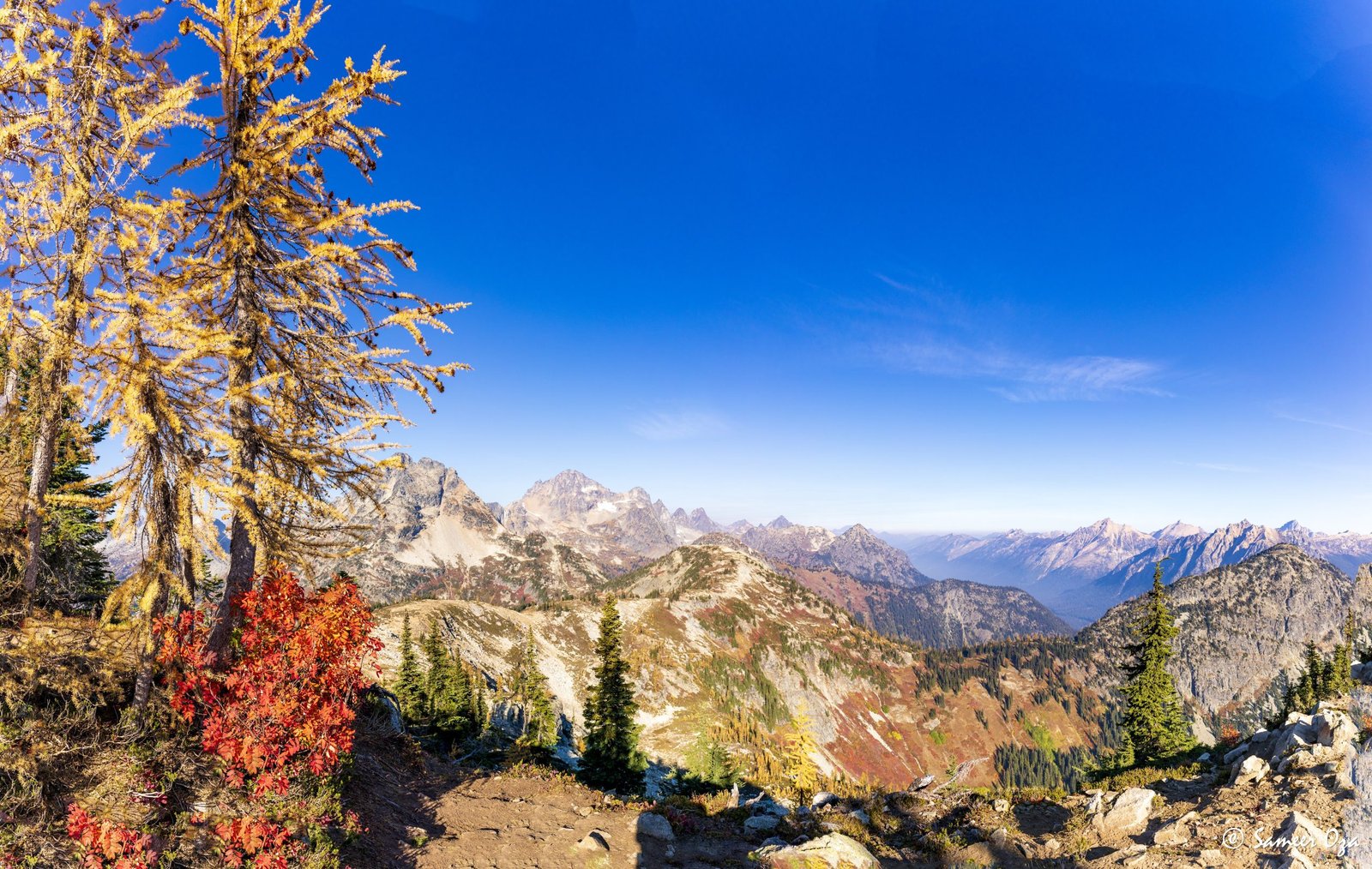 The north Cascades fall colors rival the Colorado Southwest. The yellow and red contrast is what stands out the best in my opinion. In Colorado it is the quaking aspens & cottonwoods contrasting with the Gambel oaks. In the north Cascades it is the larch (tamarack) contrasting against the red ground cover of the blueberry bushes. There is one major difference though. The Colorado fall colors are matte. The Cascade fall colors, especially the larch are glossy. The larch positively glows especially with back light from the sun! These are photographs I made from the Blue Lake and Heather-Maple Pass hikes. Further west there was a fire, so the smoke in the air made for some ethereal pictures and also made the morning alpenglow last a lot longer than we are used to.