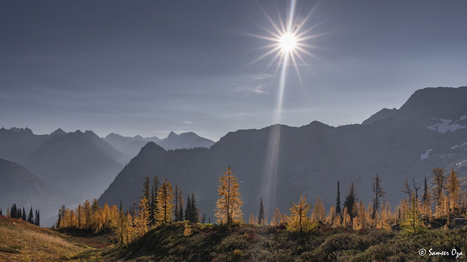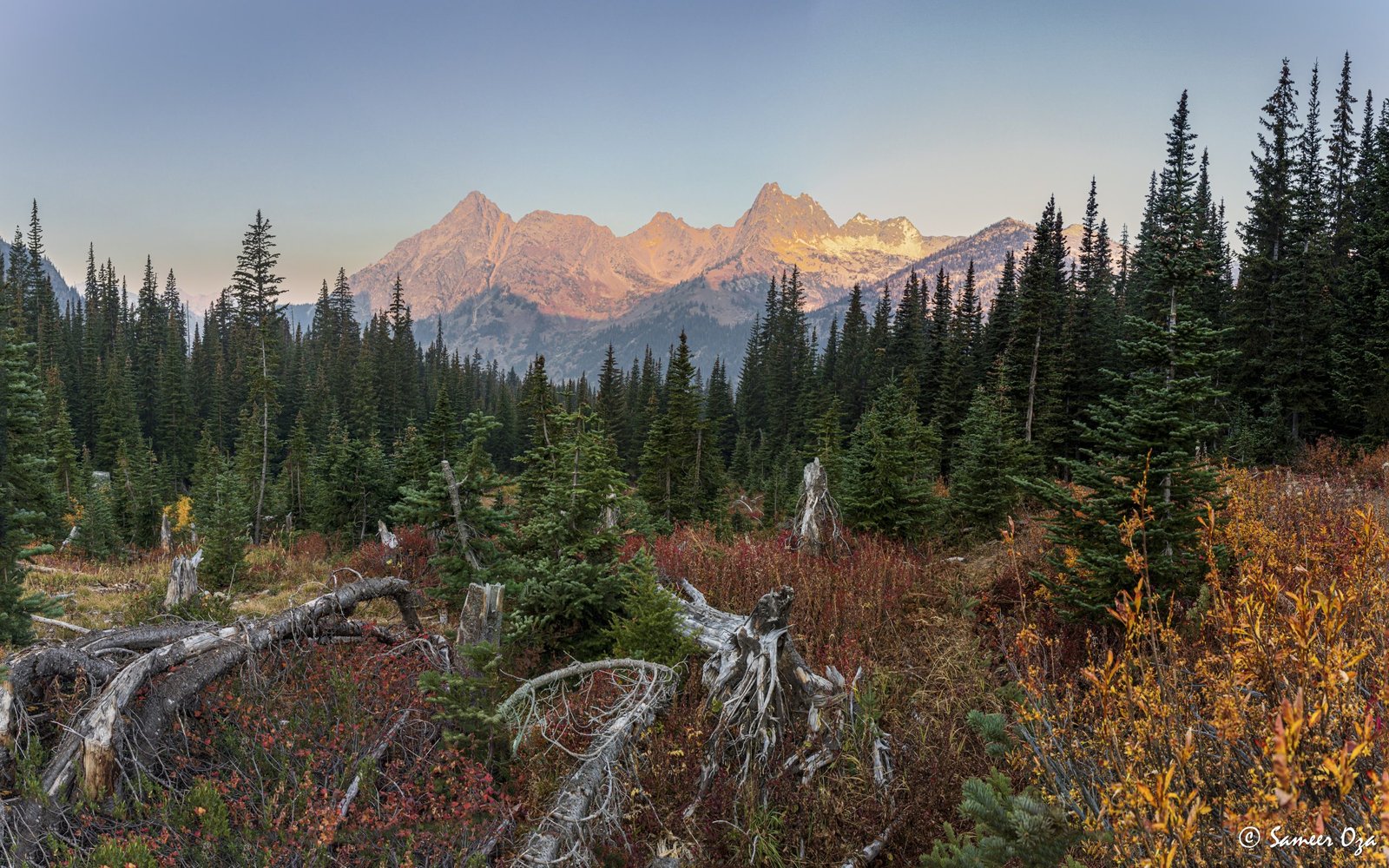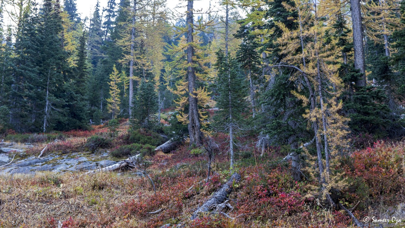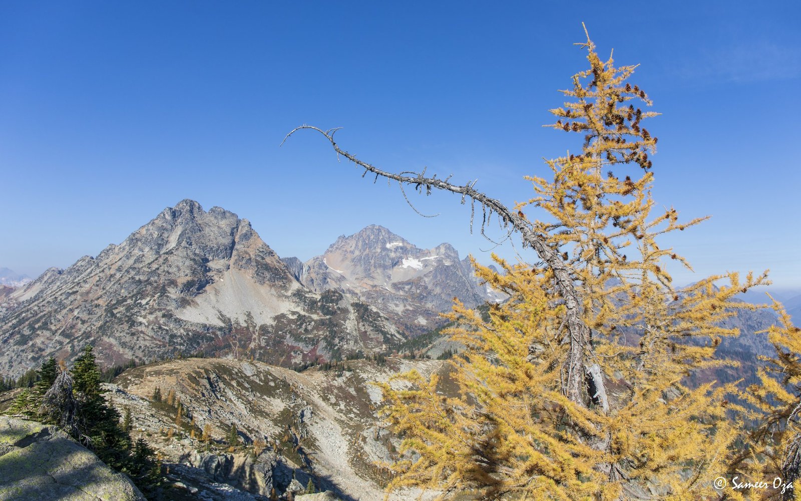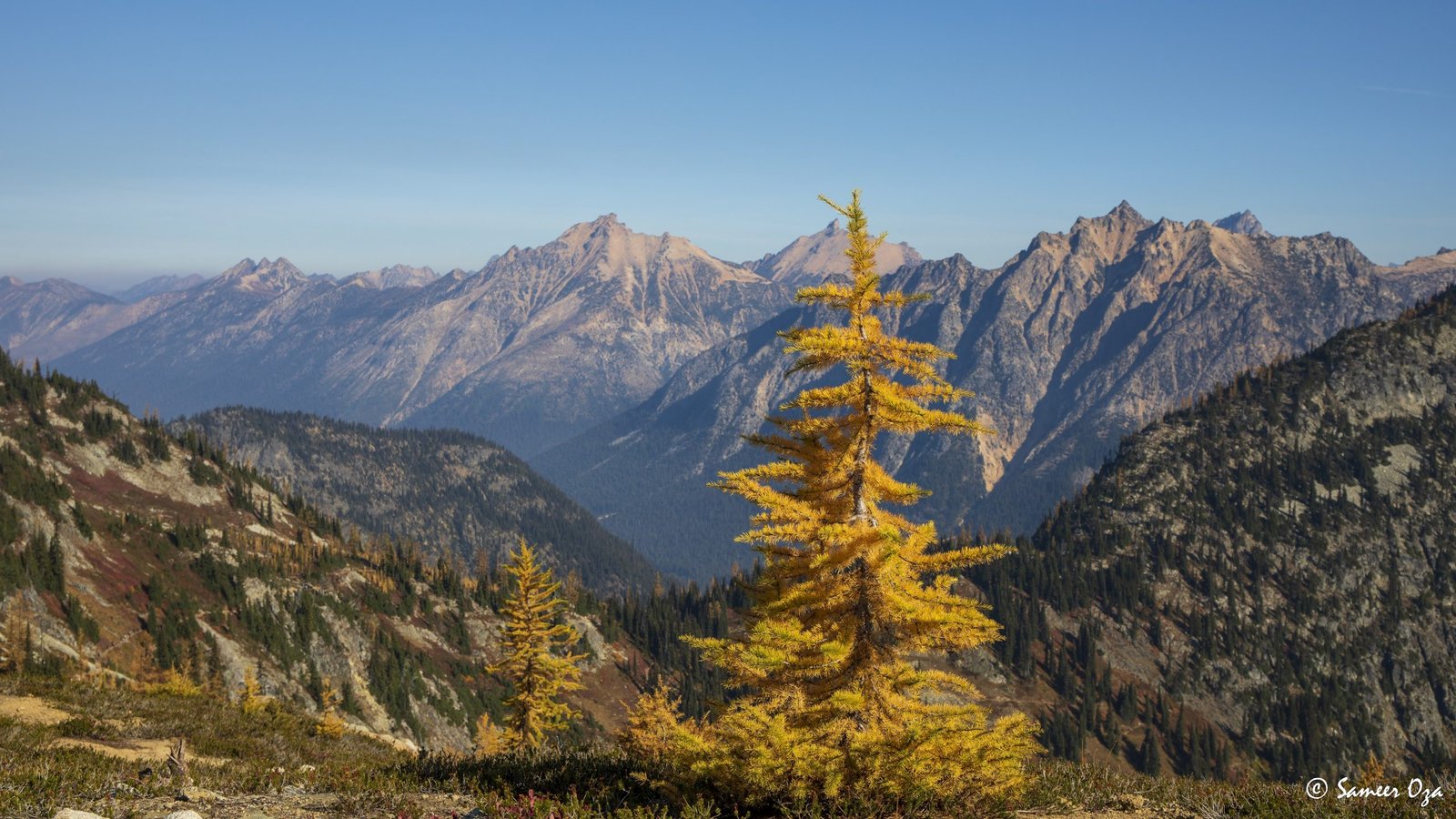 The north Cascades fall colors rival the Colorado Southwest. The yellow and red contrast is what stands out the best in my opinion. In Colorado it is the quaking aspens & cottonwoods contrasting with the Gambel oaks. In the north Cascades it is the larch (tamarack) contrasting against the red ground cover of the blueberry bushes. There is one major difference though. The Colorado fall colors are matte. The Cascade fall colors, especially the larch are glossy. The larch positively glows especially with back light from the sun! These are photographs I made from the Blue Lake and Heather-Maple Pass hikes. Further west there was a fire, so the smoke in the air made for some ethereal pictures and also made the morning alpenglow last a lot longer than we are used to.