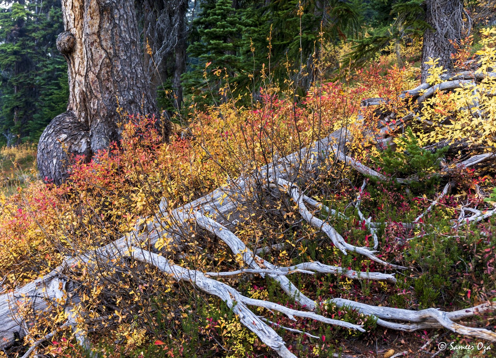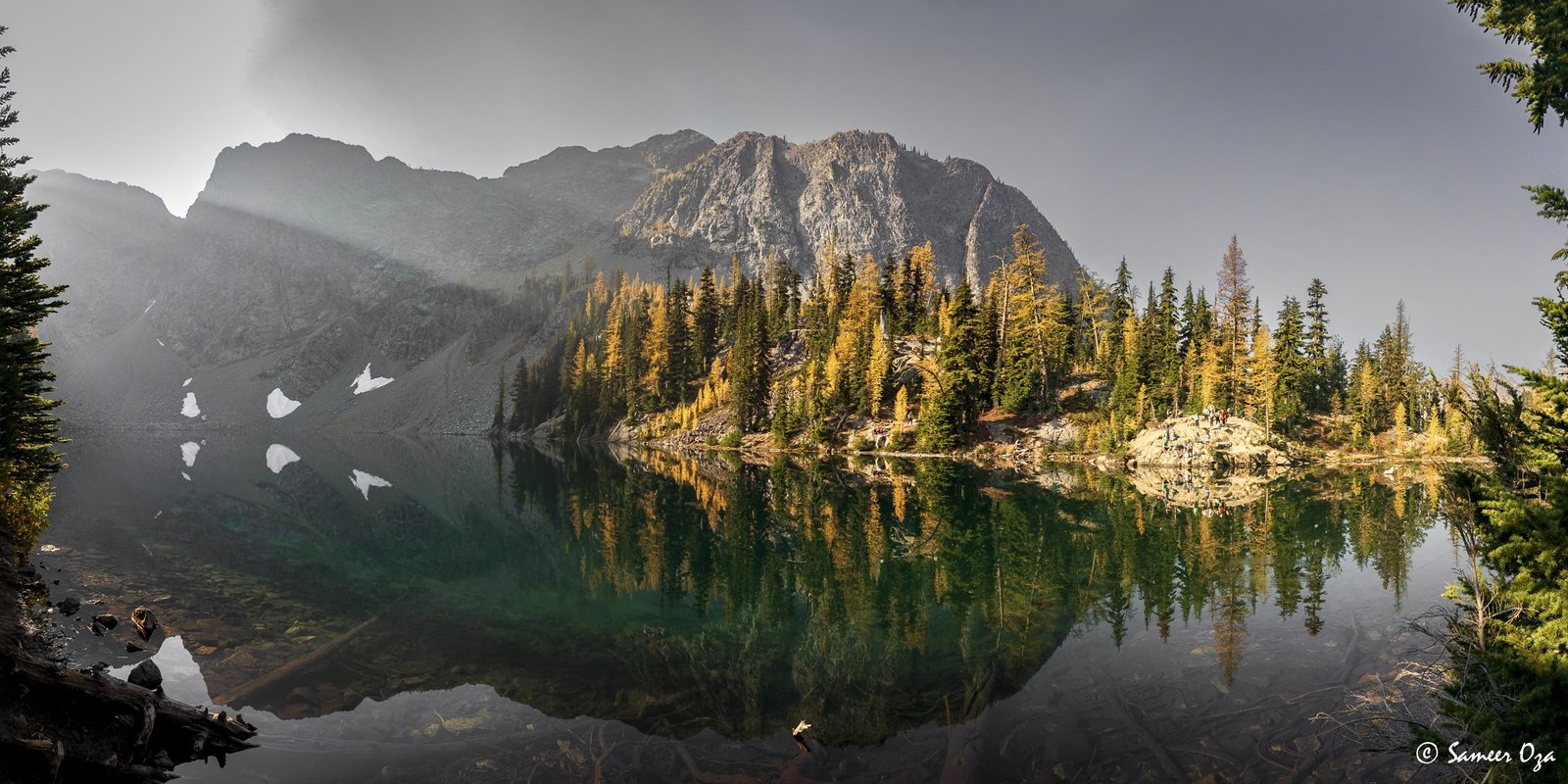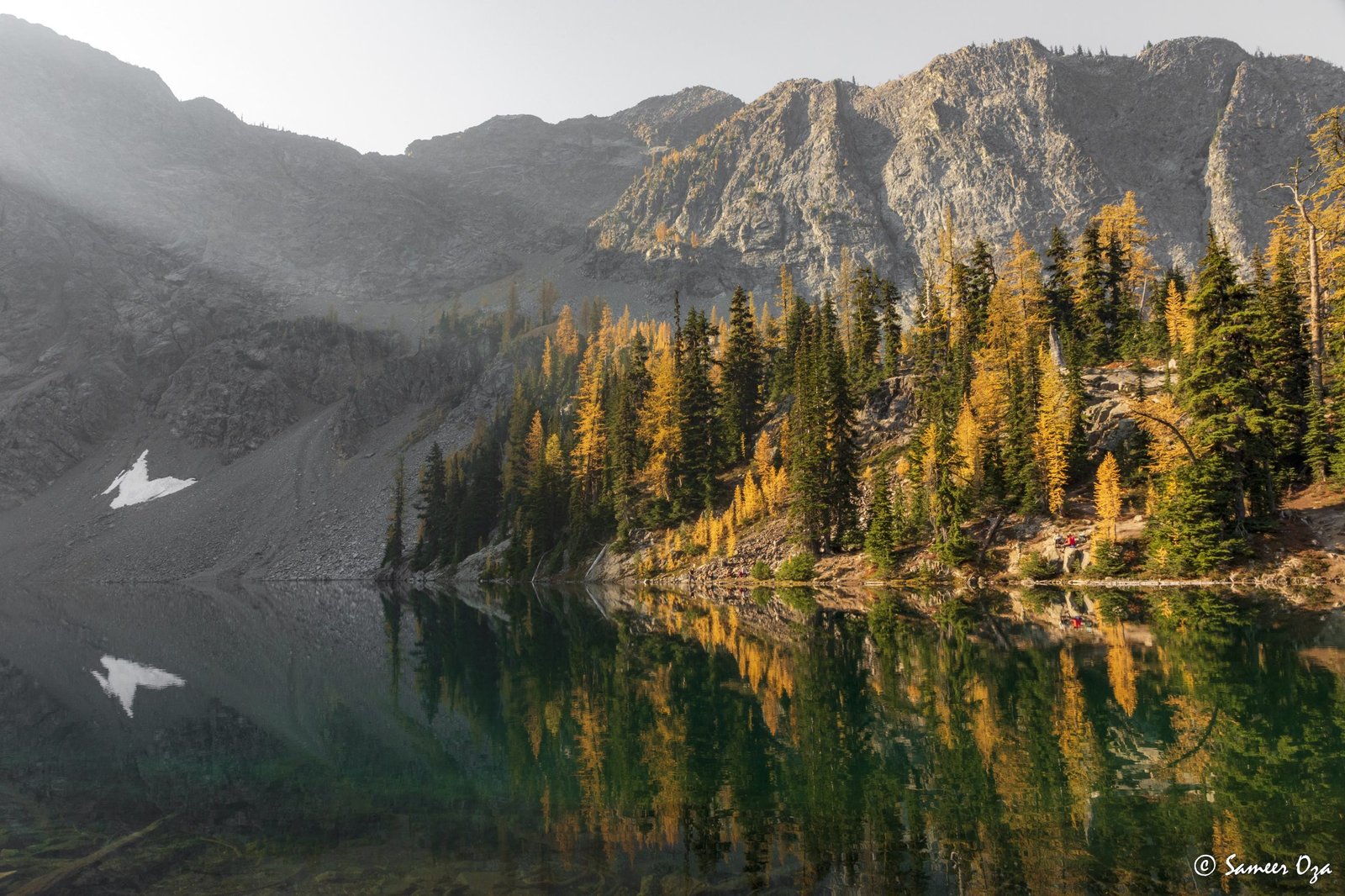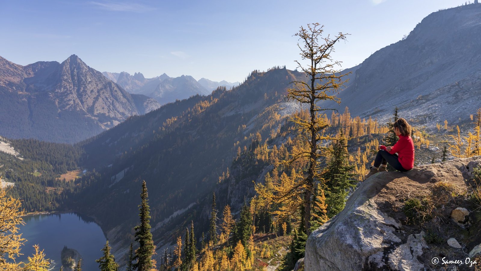 The north Cascades fall colors rival the Colorado Southwest. The yellow and red contrast is what stands out the best in my opinion. In Colorado it is the quaking aspens & cottonwoods contrasting with the Gambel oaks. In the north Cascades it is the larch (tamarack) contrasting against the red ground cover of the blueberry bushes. There is one major difference though. The Colorado fall colors are matte. The Cascade fall colors, especially the larch are glossy. The larch positively glows especially with back light from the sun! These are photographs I made from the Blue Lake and Heather-Maple Pass hikes. Further west there was a fire, so the smoke in the air made for some ethereal pictures and also made the morning alpenglow last a lot longer than we are used to.