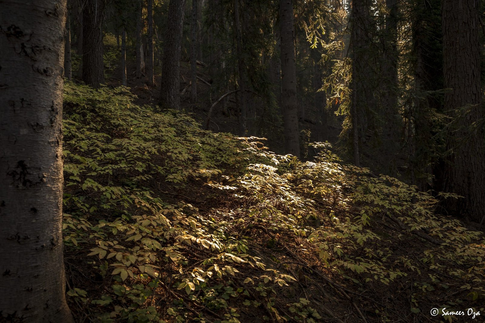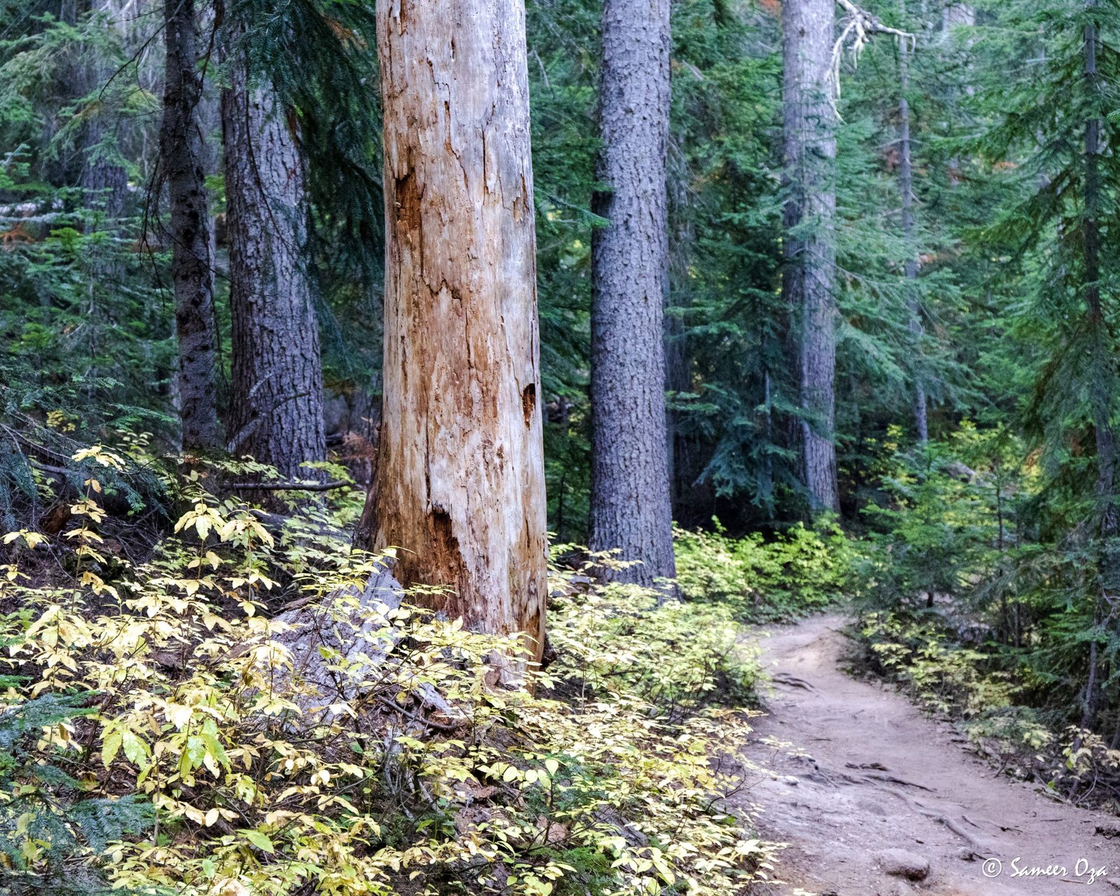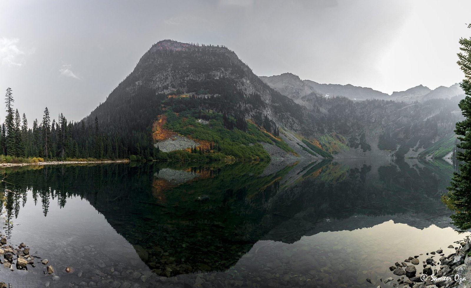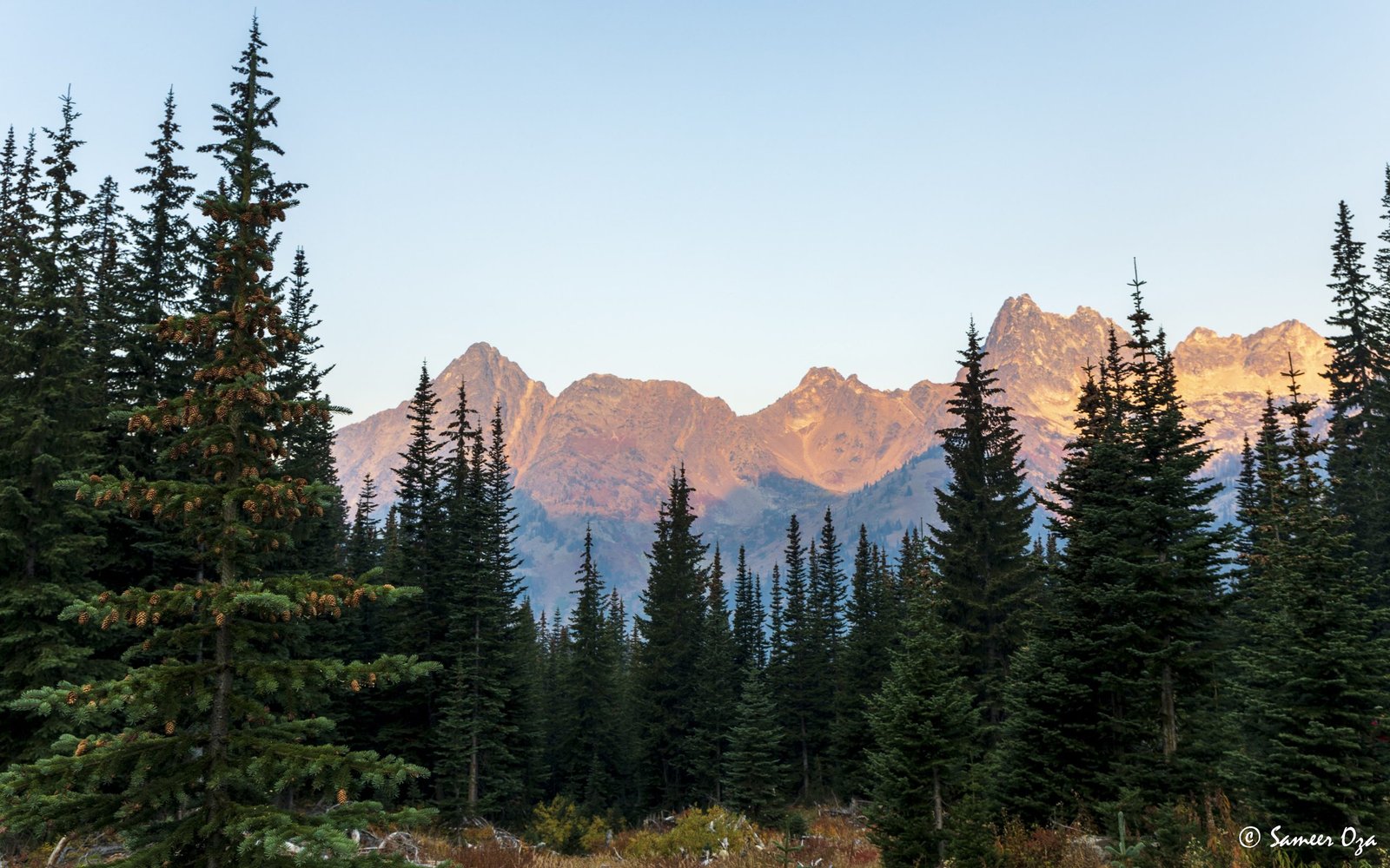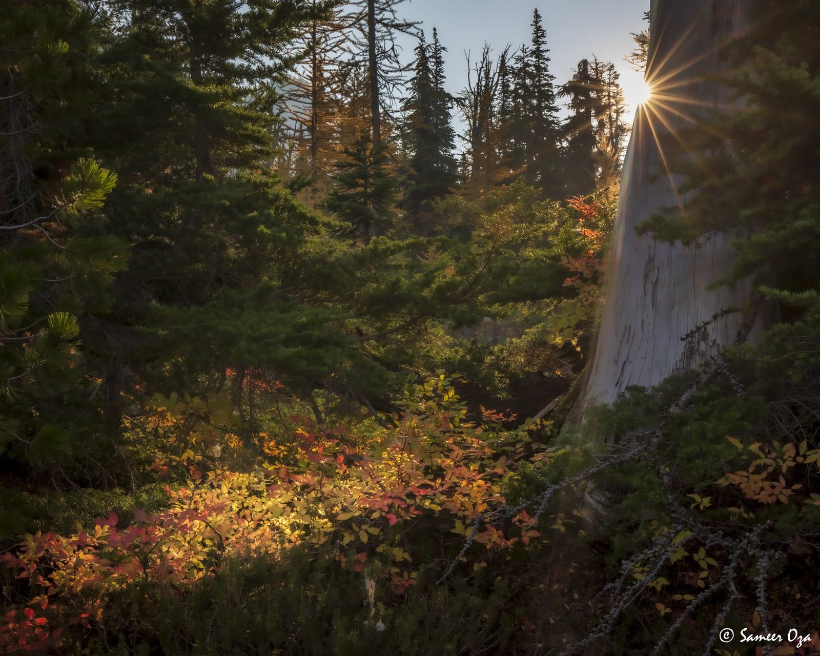 The north Cascades fall colors rival the Colorado Southwest. The yellow and red contrast is what stands out the best in my opinion. In Colorado it is the quaking aspens & cottonwoods contrasting with the Gambel oaks. In the north Cascades it is the larch (tamarack) contrasting against the red ground cover of the blueberry bushes. There is one major difference though. The Colorado fall colors are matte. The Cascade fall colors, especially the larch are glossy. The larch positively glows especially with back light from the sun! These are photographs I made from the Blue Lake and Heather-Maple Pass hikes. Further west there was a fire, so the smoke in the air made for some ethereal pictures and also made the morning alpenglow last a lot longer than we are used to.