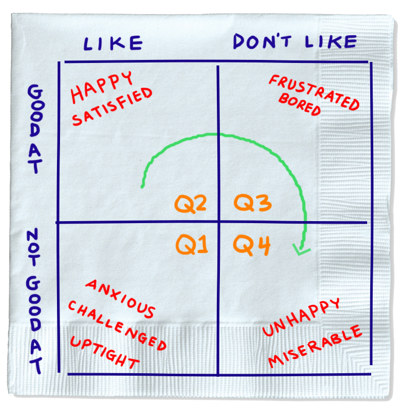 Interesting short book about career/life. Very similar concepts to Flow by Mihaly Csikszentmihalyi. The author has a very simple, “back of paper napkin” concept of a 2×2 grid of ability and enjoyment. He argues that the highest career/life satisfaction comes in Q2 and one should try to stay in that quadrant as long as possible….
